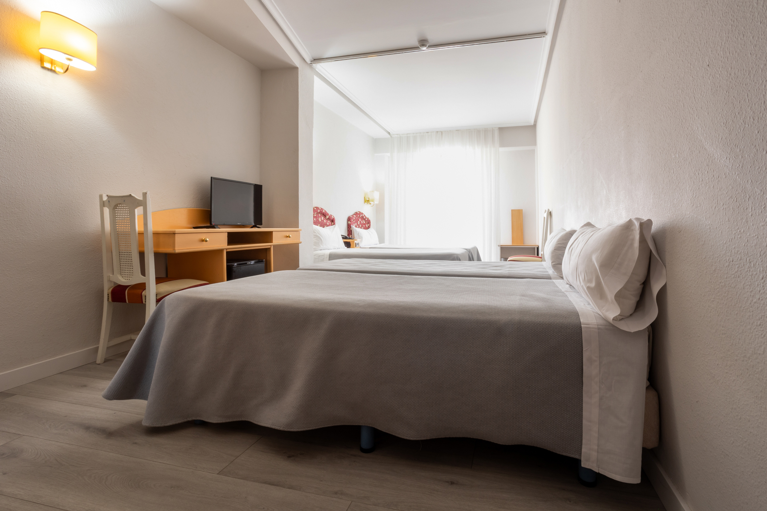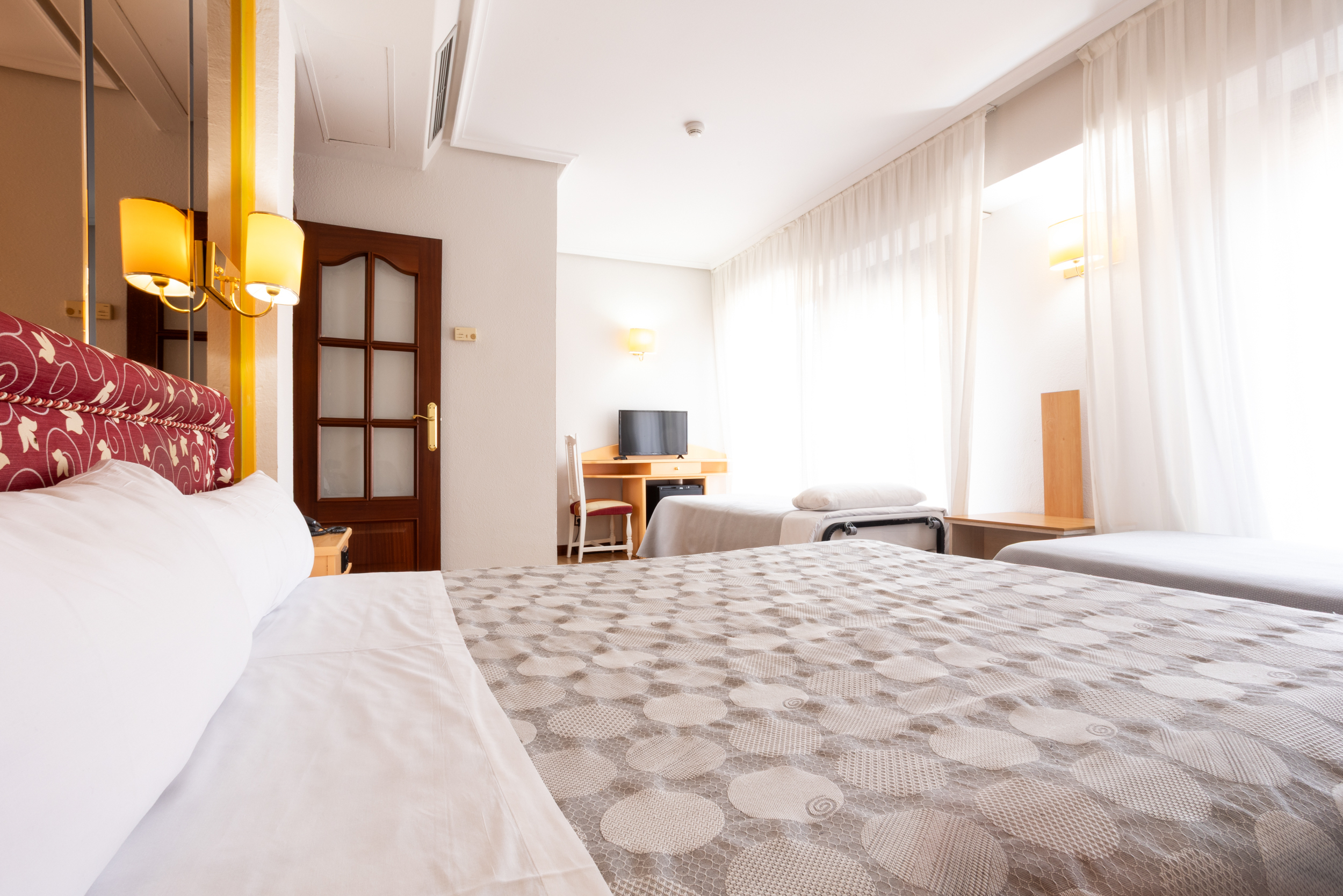 La habitación cuádruple, espaciosa y luminosa, está pensada para ofrecer la máxima comodidad a grupos de adultos o familias que buscan disfrutar de una estancia relajante y memorable. Uno de los puntos más destacados de esta habitación es, sin duda, las impresionantes vistas que ofrece. Desde el gran ventanal, los huéspedes pueden disfrutar de una panorámica espectacular de algunos de los monumentos más emblemáticos de la ciudad.