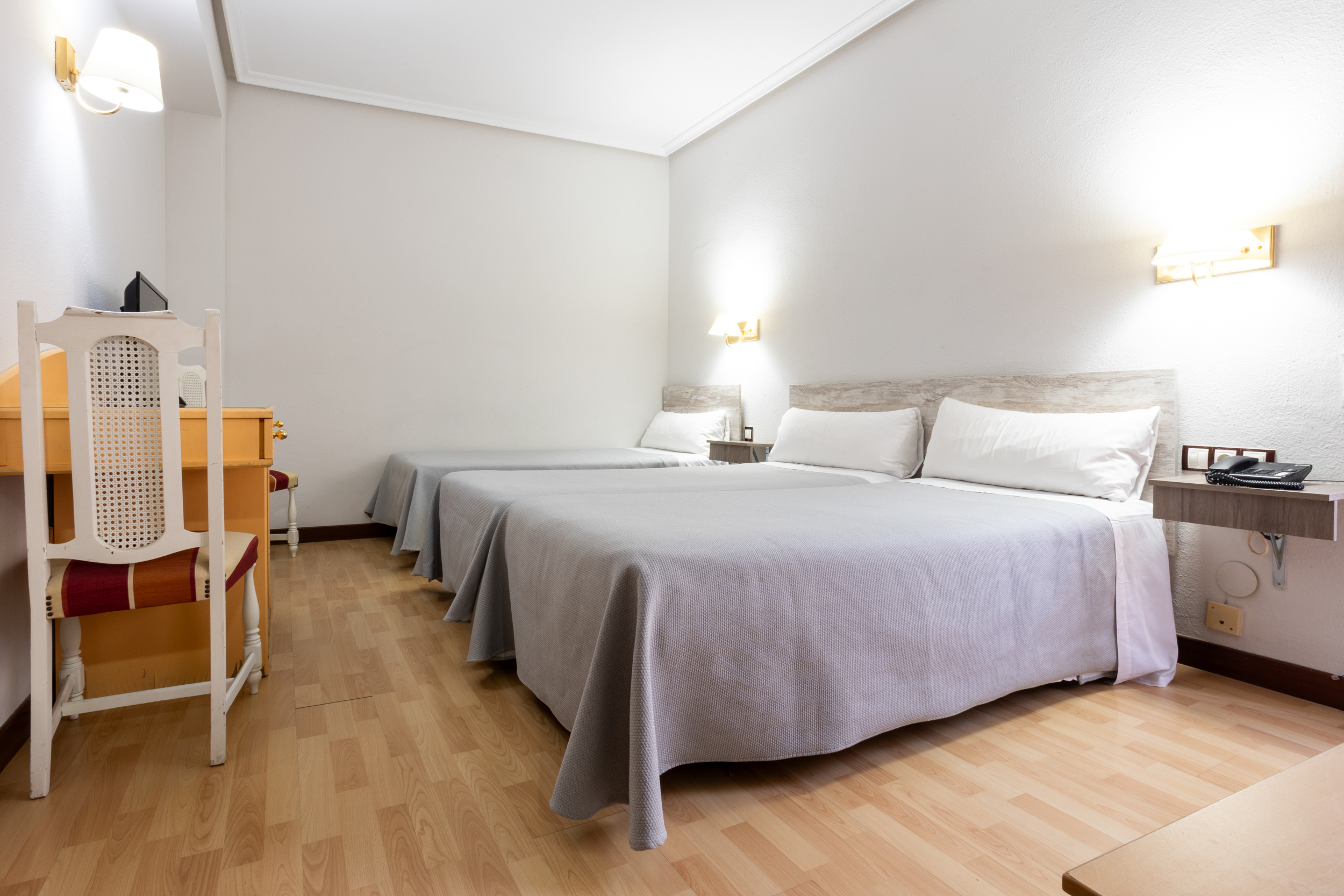 Nuestra habitación triple interior está diseñada pensando en la comodidad y el descanso de grupos de adultos y familias. Con un ambiente cálido y acogedor, esta habitación ofrece un espacio versátil y práctico, ideal para quienes buscan un refugio cómodo y tranquilo durante su estancia.